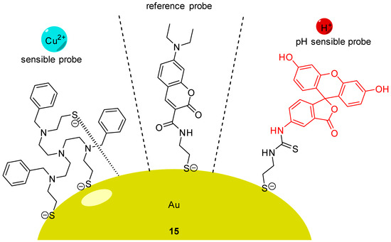 Using AuNCs, Han et al. described the preparation and characterization of a ratiometric probe 15 providing intracellular dual determinations of Cu2+ concentration and pH [65]. Three different molecules were grafted on these nanoclusters, firstly FITC 2 as pH-sensitive probe, secondly a tailor-made specific Cu-ligand (called TPAASH) and thirdly a coumarin derivative as a reference probe (Figure 15). Monitoring of Cu2+ cations is based on the quenching of AuNC emission at 722 nm (under excitation at 405 nm), following the increase of copper concentration. Therefore, coumarin was also grafted on clusters to be used as reference probe since its excitation wavelength is also about 405 nm and emission is at 472 nm. These novel particles allow the ratiometric determinations of pHin from 6 to 9, and simultaneously, of Cu2+ concentration up to 11 µM. A few years later, Zhu et al. proposed their own version of a dual pH/Cu2+ sensor by grafting FITC 2 and polyethylenimine (PEI) on carbon dots [66]. Due to a ratiometric and linear signal, they were able to determine pH and Cu2+ concentration into yogurt and human serum samples.
