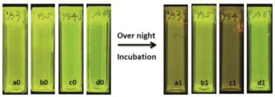 Fluorescence extinguishments due to the acidification of medium by the bacterial growth in a1 and c1. Reproduced with authorization from Si [83].