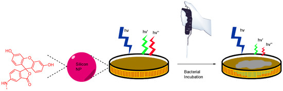 In their view, Wang et al. focused on pH monitoring in case of bacterial growth on Petri dishes cultures [84]. Since their creation in 1887, Petri dishes are still the most widely used support for in vitro cultures due to their flexibility fitting the broad microbial diversity. In addition to agarose and appropriate nutriments, Wang et al. proposed to add silicone nanoparticles bearing FA 4 and porphyrin moieties in the preparation. These nanosensors are physicochemical stable, easy to incorporate within agar preparation, are not internalized by bacteria, and are based on ratiometric method. Thus, this study offers an effective protocol to design pH-sensitive Petri dishes, which can be used to visualize bacterial growth or determine resultant pH variations due to bacterial behaviors (Figure 19).