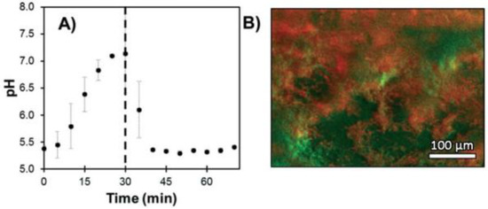 S. salivarius biofilm pH response under expositions to glucose solutions (A) and imaging of localized acidification (red) and biofilm accumulation (green) (B). Reproduced with authorization from Gashti [86].