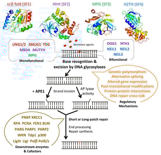 Schematic diagram illustrating the steps and enzymes involved in the base excision repair (BER) pathway. Representative structures of the different superfamilies (SF) of DNA glycosylases (SF1, α/β fold family, red; SF2, helix-hairpin-helix (HhH) family, purple; SF3, 3-methyl-purine glycosylase (MPG) family, green; SF4, helix-two-turn-helix (H2TH) family, blue) responsible for recognition and removal of damaged bases are shown. After cleavage of the damaged strand by an apurinic/apyrimidinic (AP) endonuclease, APE1, or by the AP lyase activity of bifunctional DNA glycosylases, downstream BER enzymes together with several cofactors (listed in brown) prepare the damaged site for de novo synthesis using one of two sub-pathways: short-patch or long-patch repair. DNA glycosylases are tightly regulated at the gene, mRNA, and protein levels by a set of regulatory systems (listed in orange). UNG1/2: uracil-N glycosylase 1 or 2; SMUG1: single-strand-specific monofunctional uracil DNA glycosylase 1; TDG: thymine DNA glycosylase; MBD4: methyl-CpG-binding protein 4; MUTYH: MutY homolog DNA glycosylase; OGG1: 8-oxo-G DNA glycosylase 1; NTH1: endonuclease III-like 1; NEIL1-3: endonuclease VIII-like 1-3.
