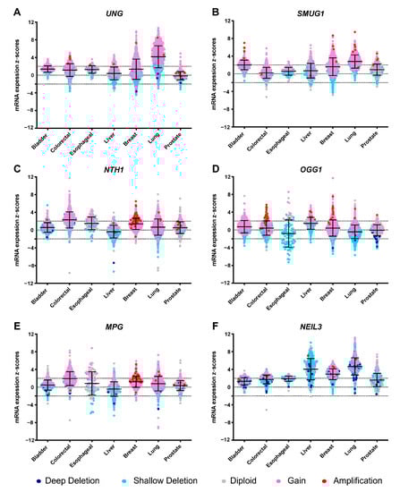 mRNA expression profiles of six representative DNA glycosylase genes in various carcinomas. mRNA expression profiles of UNG (A), SMUG1 (B), NTH1 (C), OGG1 (D), MPG (E) and NEIL3 (F). Data were extracted from the cBio Cancer Genomics Portal [] by computing the expression of an individual gene in a tumor sample (z-score) relative to the gene’s expression in the normal sample. Samples with expression z-scores >2 or <−2 (indicated with dotted lines) in any queried gene are considered altered. mRNA expression levels are organized according to the copy-number level per gene: Deep deletion (dark blue) indicates a deep loss, possibly a homozygous deletion; shallow deletion (sky blue) indicates a shallow loss, possibly a heterozygous deletion; diploid (gray); gain (pink) indicates a low-level gain (a few additional copies, often broad); and amplification (red) indicates a high-level amplification (more copies, often focal). Cancer types: Bladder urothelial carcinoma (bladder; N = 404), colorectal adenocarcinoma (colorectal; N = 590), esophageal squamous cell carcinoma (esophageal; N = 94), hepatocellular carcinoma (liver; N = 358), invasive breast carcinoma (breast; N = 1068), non-small cell lung cancer (lung; N = 991), and prostate adenocarcinoma (prostate; N = 488).
