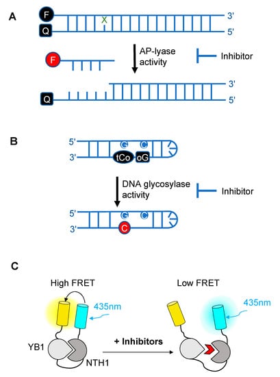 Schematic diagrams illustrating the different fluorescence-based assays developed over the past decade for high-throughput screening (HTS) of chemical libraries for the selection of inhibitors of either the AP-lyase activity [] (A), the DNA glycosylase activity [] (B) of DNA glycosylases, or of the interaction interface (C) between a DNA glycosylase (here, NTH1) and its cellular partner (YB1) []. FRET: Förster resonance energy transfer. In (A), X denotes a damaged base processed by DNA glycosylases. Cleavage by the AP lyase activity results in the release of the fluorophore-labeled lesion-containing strand and fluorescence emission (red F). In (B), release of a modified 8-oxo-G base (oG) linked to a quencher that specifically quenches the highly fluorescent DNA base analogue, tCo, covalently bound to the neighboring base, leads to fluorescence emission (red C). In (C), NTH1-YB1 complex formation is associated with high FRET levels, which are significantly reduced by inhibitors (red wedge) of the PPI interface.
