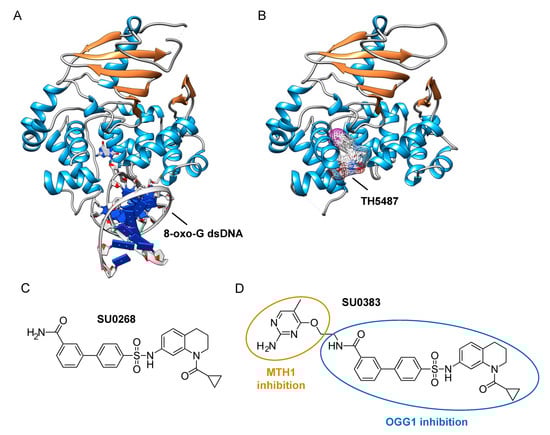 Identification of specific inhibitors of human OGG1. (A) Crystal structure of human OGG1 crosslinked to 8-oxo-G containing dsDNA (PDB: 6W0M; []). (B) Crystal structure of human OGG1 bound to an active site-specific inhibitor, TH5487 (PDB 6RLW), represented in ball and sticks and as a transparent mesh. (C) Chemical structure of the highly specific OGG1 inhibitor selected by Tahara and colleagues [], SU0268. (D) Chemical structure of the dual inhibitor, SU0383, which efficiently blocks both MTH1 and OGG1 activities [].