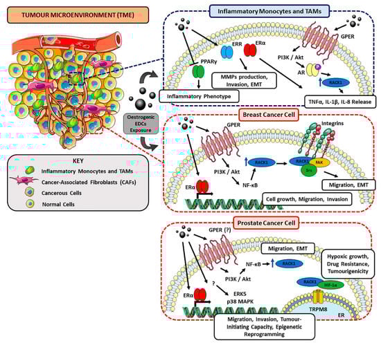Literature data here presented strongly suggest a tight correlation between EDCs exposure and their involvement in cancer development and progression and, on the other hand, in alterations of the immune system through their activity on TME and cellular signalling cascades. In this regard, the identification of RACK1 as a possible EDC target in the immune context and, at the same time, its importance in tumour progression may indicate that RACK1 could play a dual role in BC- and PC-associated TME establishment and in modification of the immune response, particularly related to xeno-oestrogenic EDCs.