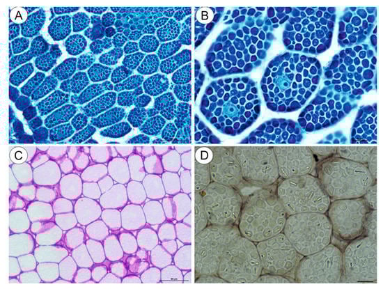 - Fisher, D.B. Protein staining of ribboned epon sections for light microscopy. Histochemie 1968, 16, 92–96. [Google Scholar] [CrossRef]