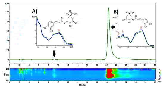 - Pedrosa, M.M.; Muzquiz, M.; García-Vallejo, C.; Burbano, C.; Cuadrado, C.; Ayet, G.; Robredo, L.M. Determination of caffeic and chlorogenic acids and their derivatives in different sunflower seeds. J. Sci. Food Agric. 2000, 80, 459–464. [Google Scholar] [CrossRef]