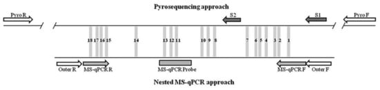 Representation of the CpG island analyzed in p16/INK4a promoter. The 18 CpG sites analyzed by pyrosequencing and MS-qPCR are represented as grey bars and are numbered from 1 to 18 in the reverse strand. Above, the design used for the pyrosequencing approach, including PCR primers (Pyro F and Pyro R) and sequencing primers (S1 and S2). Below, the design of the nested-qPCR approach, including PCR outer primers (Outer F and Outer R), qPCR primers (MS-qPCR F and MS-qPCR R) and probe (MS-qPCR Probe).