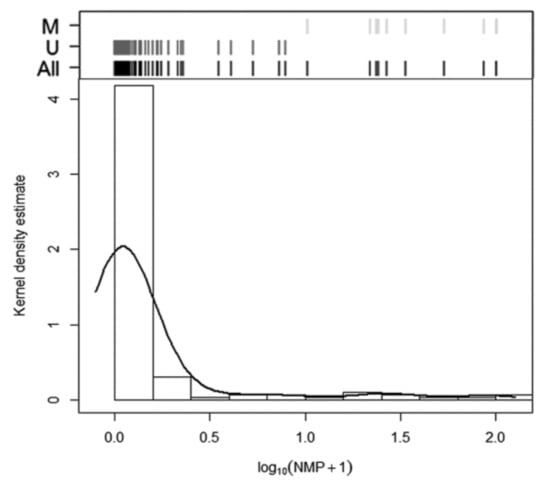 Methylation analysis using MS-qPCR. Histogram and kernel density estimation of the distribution of NMP expressed as (log10(NMP + 1)). The Classification graph based on the natural cut-off derived from cluster analysis is shown above the histogram. Black lines: all samples; dark grey lines: unmethylated (U) group; light grey lines: methylated (M) group.