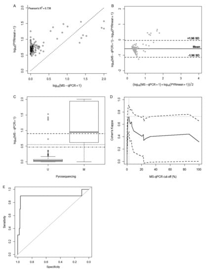 Given the low sensitivity of the original natural cut-off for NMP (6.86%) to detect pyrosequencing methylation, we explored two alternative strategies. Firstly, we derived a new optimal cut-off based on the Cohen’s kappa values. These values corresponded to each of the possible cut-offs based on NMP values to measure the agreement between each one of them and the pyrosequencing measurement. According to this approach, the optimal NMP cut-off for the maximal agreement between methods (maximal kappa index) resulted in 2.53% (Figure 4D). This corresponded to a kappa index of concordance of 0.728, indicating a good level of agreement between both techniques. Moreover, in terms of accuracy to predict methylation according to pyrosequencing, this new cut-off for MS-qPCR entailed better sensitivity than the original natural 6.86% cut-off (80% vs. 50%), maintaining the level of specificity (96%).
