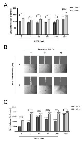 Prolidase promotes proliferation and migration of HaCaT cell lines. (A) Cell proliferation was evaluated by CyQuant Proliferation assay after 24 and 48 h upon prolidase supplementation. (B) Microscopic images of wound closure in scratched assay monitored using an inverted microscope (40× magnification) after 24 and 48 h incubation with prolidase (50 nM) compared to control cells. Supplementary Materials contain microscopic images in triplicates (Supplementary Figure S1). (C) The wound closure rate was evaluated by ImageJ software in HaCaT cells treated for 24 and 48 h with prolidase at concentrations of 1–100 nM. EGF was used as a positive control. A mean ± SEM of three replicates is presented. The results are significant at c < 0.05, aa, bb, or cc < 0.01, ccc < 0.001, and aaaa, bbbb, or cccc < 0.0001 and are marked as a vs. control (0 nM of PEPD) of 24 h incubation, b vs. control (0 nM of PEPD) of 48 h incubation, and c marked 24 h incubation cells vs. 48 h incubation cells at the same concentration of PEPD or EGF, respectively.