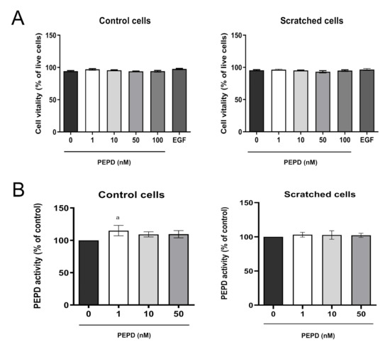 Prolidase exhibits dual biological activity as an enzyme and an EGFR ligand [20]. To exclude the possibility that extracellular prolidase affects intracellular prolidase activity, the enzyme activity was measured in prolidase treated keratinocytes. There was no difference in prolidase activity upon prolidase treatment (1–50 nM, 24 h) of HaCaT cells in both control and scratched cell models (Figure 2B).