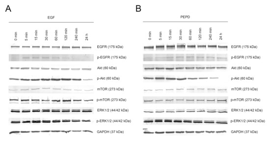 Kinetic analysis of phosphorylation of the epidermal growth factor receptor (EGFR) and its downstream signaling proteins induced by EGF (A) and PEPD (B) at concentration of 10 nM after 0, 5, 15, 30, 60, 120, and 240 min and 24 h upon supplementation. Representative blot images are shown (densitometric analysis of presented protein is included in Supplementary Materials (Supplementary Figure S2)).