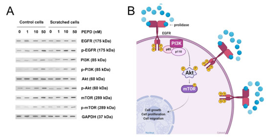 To establish whether prolidase-dependent functions undergo through EGFR, the expression of downstream signaling proteins was measured in prolidase-treated keratinocytes. As shown in Figure 4A, in prolidase-treated cells (1–50 nM, 24 h) the expressions of the total forms of EGFR, PI3K (p85), Akt, mTOR proteins were increased in a dose-dependent manner. To prove that prolidase activates EGFR in the HaCaT cell line under normal and scratch conditions, Western immunoblotting was applied to evaluate the phosphorylated forms of all aforementioned signaling proteins. As can be seen in Figure 4A, HaCaT cells treated with prolidase (1–50 nM, 30 min) caused phosphorylation of EGFR (Tyr1068) and downstream molecules including PI3K p85 (Tyr458)/p55 (Tyr199), Akt (Ser473), and mTOR (Ser2448). Figure 4B presents a schematic illustration of the PEPD-dependent stimulation of the EGFR-downstream signaling pathway.