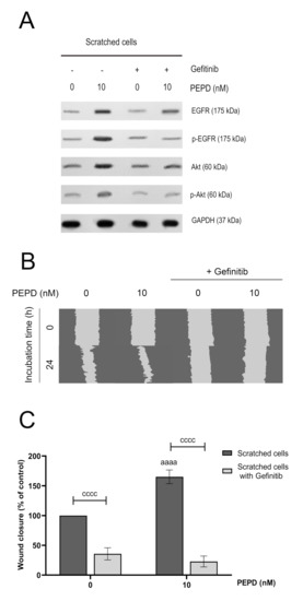 Prolidase-induced EGFR signaling was confirmed by an experiment showing that blocking EGFR abolished PEPD-dependent effects. The cells pretreated with Gefitinib (2 µM, 2 h), a specific EGFR inhibitor, suppressed PEPD-induced EGFR-downstream signaling. The inhibitor strongly diminished PEPD-related EGFR and Akt phosphorylation and the number of total proteins of EGFR and Akt (Figure 5A). Subsequently, we tested cell migration in the presence of prolidase and Gefitinib to investigate the effect of prolidase on migratory ability upon blockade of EGFR. We observed that HaCaT cells pretreated with the EGFR inhibitor and then supplemented with prolidase (10 nM) lost their capacity to migrate (Figure 5B). Quantification of the scratch area demonstrated that prolidase-treated HaCaT cells remained unchanged compared to control after 24 h (Figure 5C).