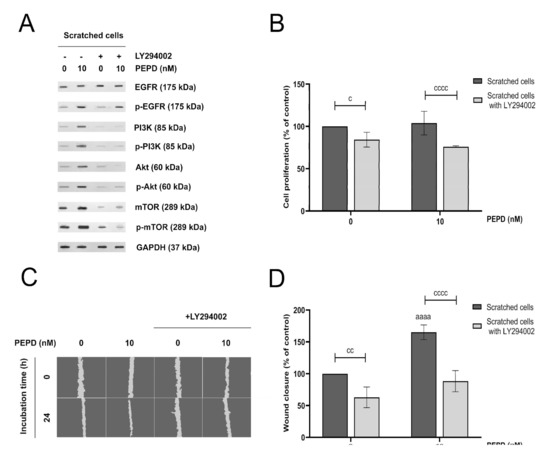 PI3K/Akt/mTOR signaling pathway is involved in prolidase-mediated proliferation and migration of HaCaT cells. (A) EGFR-downstream signaling pathway proteins analyzed by Western immunoblotting in lysates of scratched HaCaT cells incubated with prolidase (10 nM) and an inhibitor of PI3K (LY294002) for 30 min and 24 h. Representative blot images are shown (densitometric analysis of presented protein is included in Supplementary Materials (Supplementary Figure S6)). (B) Cell proliferation of scratched HaCaT cells incubated with prolidase and LY294002 for 24 h. (C) Prolidase- and LY294002-treated keratinocytes were scratched and monitored using an inverted microscope at 0 and 24 h of incubation. Supplementary Materials contain microscopic images in triplicates (Supplementary Figure S7). (D) Prolidase and LY294002-stimulated HaCaT cell migration was calculated using ImageJ software and presented as a percent of scratched control cells. A mean ± SEM of three replicates is presented. The results are significant at cc < 0.01, and aaaa, or cccc < 0.0001 and are marked as a vs. control (0 nM of PEPD) of scratched cells, b vs. control (0 nM of PEPD) of scratched cells pretreated with LY294002, and c marked scratched cells vs. scratched cells pretreated with LY294002 at the same concentration of PEPD, respectively.