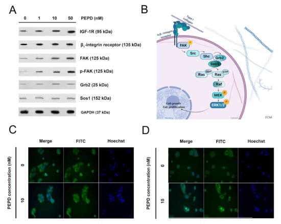 Prolidase stimulated HaCaT cells to express the β1-integrin receptor and insulin-like growth factor 1 receptor (IGF-1R). Activation of the β1-integrin receptor and IGF-1R was accompanied by an increase in the expression of downstream proteins such as FAK, Grb2, and Sos1 (Figure 7A). Phosphorylation of FAK (Tyr397) was detected under prolidase treatment. The potential signaling pathway, which mediates Ras/Raf/ERK signaling is illustrated in Figure 7B. Immunofluorescence analysis confirmed an increase in the expression of EGFR upon prolidase stimulation in a model of scratched cells (Figure 7C). Moreover, it proved that FAK was stimulated in mechanically damaged keratinocytes subjected to prolidase treatment (Figure 7D).