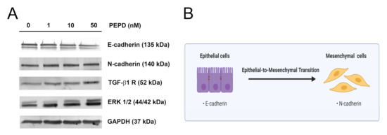 In a scratching experiment, we observed that prolidase enhanced the ability of keratinocytes to migrate. Thus, we tested whether PEPD is involved in the promotion of the epithelial-to-mesenchymal transition (EMT) process. We evaluated the effect of prolidase on this process at the protein level under conditions of mechanical damage in cultured HaCaT cells. Using Western immunoblotting, we found that the levels of expression of key EMT markers such as E-cadherin and N-cadherin were slightly downregulated and upregulated, respectively (Figure 8A). It is known that non-canonical activation of the TGF-β1 receptor also mediates EMT through MAPK signaling including ERK1/2 and p38 [22]. To examine whether this pathway was affected by prolidase, we performed Western immunoblotting for the TGF-β1 receptor (TGF-β1R) and ERK1/2. We found that the levels of expression of TGF-β1R and ERK1/2 were upregulated, compared to control cells indicating that EMT occurred. As can be seen in Figure 8B, loss of E-cadherin and the gain of N-cadherin facilitates the migratory phenotype of cells promoting their migration. E-cadherin is involved in the formation of tight cell–cell junctions, thus their lost may result in increased keratinocyte migration.