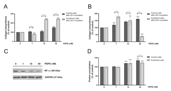 Extracellular prolidase stimulates collagen biosynthesis in HaCaT cells via an increase in proline synthesis and a downregulation of the level of NF-ĸβ. (A,B) Collagen biosynthesis was measured in prolidase-treated HaCaT cells (1–50 nM) after 24 and 48 h. (C) Analysis of NF-ĸβ in the cell lysate of keratinocytes upon PEPD supplementation after 24 h using Western immunoblotting. Representative blot images are shown (densitometric analysis of presented protein is included in Supplementary Materials (Supplementary Figure S10). (D) LC–MS-based analysis of proline concentration in prolidase-treated HaCaT cells after 24 h incubation. The results represent a mean ± SEM of three replicates are significant at a = < 0.05, aaa, or bbb, < 0.001, and aaaa, bbbb, or cccc < 0.0001 and are marked as a vs. control (0 nM of PEPD) of unscratched (control) cells, b vs. control (0 nM of PEPD) of scratched cells, and c marked unscratched (control) cells vs. scratched cells in the same concentration of PEPD, respectively.