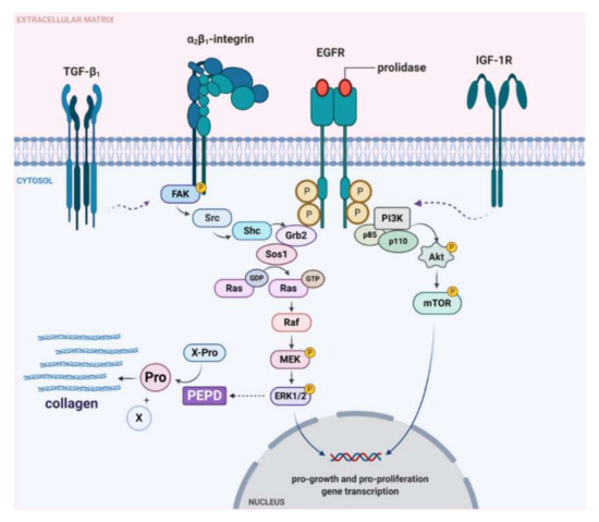 Graphical illustration of prolidase-dependent EGFR, β1-integrin receptor, TGF-β1, and IGF-1R-downstream signaling. Under experimental conditions of mechanically damaged HaCaT cells, prolidase causes activation of the ERK1/2 and PI3K/Akt/mTOR pathways resulting in increased collagen biosynthesis and cell proliferation and migration. Created with BioRender.com.