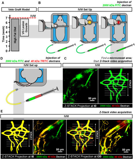 Figure 1. 2P-IVM pipeline to image plaque angiogenesis in advance atherosclerotic lesions and to assess dextrans extravasation in continuous, fenestrated and plaque microvessels. (A) After 3 weeks of hypercholesteremic diet, ApoE3*Leiden mice (n = 12) undergo VG surgery. Four weeks later, (B) mice are prepared for IVM and plaque microvessels in the VG lesions, continuous microvessels in ear skin, fenestrated microvessels in parotid glands are imaged by injection of 2000 kDa-FITC dextran intravenously. (C) Areas of interest are evaluated by time-lapse Z-stack acquisition over 20 min. (D,E) Injection of 40 kDa-TRITC 2000 kDa-FITC dextran solution is used to assess vessel permeability by quantification of FICT and TRITC fluorescence extravascular intensities in Z-stack projections.