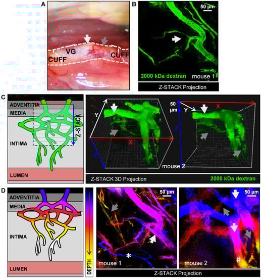 Figure 2. Detection of plaque angiogenesis by 2P-IVM by injection of the plasma tracer 2000 kDa-FITC dextran in atherosclerotic lesions in ApoE3*Leiden mice VGs. (A) 28 days after surgery, areas of interest (white arrows: white thick regions, grey arrows: red thin regions) were imaged to study the architecture of plaque microvessels. (B) Z-stack projection of plaque microvessels (white arrows: branching). See also Video 1 (total Z-depth of 111 µm, 2 µm step); (C) Illustration of Z-stack acquisition in VG lesions and representative Z-stack 3D projections of adventitial (white arrows) and intimal microvessels (grey arrows) from one mouse at two different angles. See also video 2 for 360 view. Note that the large adventitial microvessels are also extending in Z because they are curved around the vein. (D) Z-stack projections from two mice with a Z-depth color code filter (white arrows: Adventitial microvessels; grey arrows: Intimal microvessels). Due to the curved nature of the vein: (*) Intimal microvessel is discriminated from adventitial microvessel based on its size, despite being located in a top Z layer; (#) Adventitial microvessel is discriminated from an intimal microvessel based on its size, despite being located in a deeper Z layer.