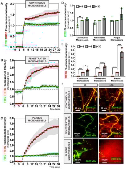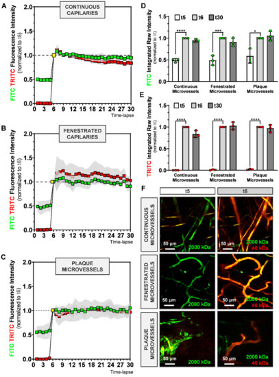Figure 3. Evaluation of time-lapse imaging of 2000 kDa-FITC and 40 kDa-TRITC RFI inside the microvessel structures of (A) continuous, (B) fenestrated and (C) plaque microvessels. (D,E) Quantification of FITC and TRITC intravascular RFI at time-lapse 5, 6 and 30. (F) Representative max-projection of FITC and TRITC signal in continuous, fenestrated and plaque microvessels at t5 and t6. Data presented as mean ± SD. * p ≤ 0.05, *** p ≤ 0.001, **** p ≤ 0.0001 by 1-way-ANOVA.