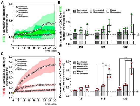 Figure 5. Evaluation of 2000 kDa-FITC and 40 kDa-TRITC dextrans extravasation in continuous, fenestrated and plaque microvessels. Time dependent evolution of (A) FITC and (C) TRITC extravascular RFI between groups. Comparison of (B) 2000 kDa and (D) 40 kDa extravasation at different timepoint between groups. Data presented as mean ± SD (SD is expressed as a green (A) or red (C) cloud). ** p ≤ 0.001, *** p ≤ 0.001, by 1-way-ANOVA.