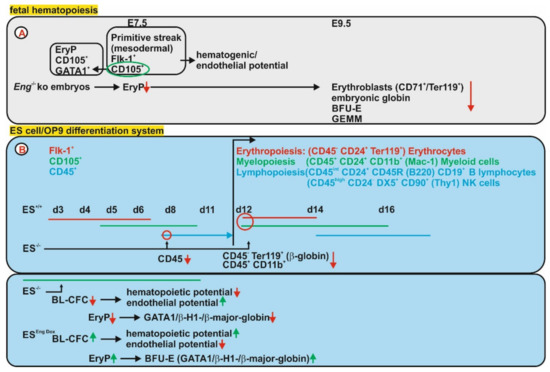 In terms of the fetal hematopoiesis it can be summarized that Endoglin is expressed in early erythroid precursors (EryP) and mesodermal precursors with hematogenic and endothelial potential. Aberrant expression of Endoglin affects mainly the erythroid lineage but also to a minor extent the myeloid and lymphoid lineages.
