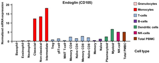 Transcript analysis of endoglin expression in peripheral blood cells. Transcript analysis of peripheral blood cells verified the very low presence of endoglin in granulocytes, low expression in T- and B-cells and showed a high expression in monocytes. In addition, dendritic cells express considerable amounts of Eng mRNA. Expression data were taken from the entry for Endoglin in the Human Protein Atlas [101].