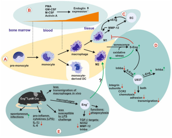 Aside the initially identified long form of human Endoglin (L-Eng), a short splice variant S-Eng was identified in ECs, placenta and myelomonocytic cell lines (HL-60, U937), both of which bind TGF-β1 [129]. S-Eng is also expressed in mouse and rat and due to its different C-terminus compared to L-Eng acts in a different way in processes of differentiation, cancer, migration and senescence [16,17,130,131,132,133]. To shed more light on the function of Endoglin in monocytes and the differential roles of L- and S-Eng, RNA of corresponding U937 were analyzed by using a genomic expression microarray [130,133]. These studies revealed that key processes are affected including cell adhesion and transmigration, which are crucial for leukocyte recruitment in an inflammatory scenario [133]. Both variants of Endoglin downregulated the chemokine receptor CCR2, and different integrin subunits, an effect which could be verified in peripheral blood macrophages from HHT-1 patients and Eng targeted, siRNA-treated HUVECs [133]. Impaired homing of peripheral blood mononuclear cells has been described for HHT-1 patients before [134]. On the other hand, the ligands Activin A (macrophage differentiation/polarization) and IL-1β were differentially regulated by the two isoforms of Endoglin. In addition, both Endoglin variants reduce the macrophage maturation marker CD11b [133]. Analysis of primary macrophages isolated from the peritoneal cavity of mice revealed that S-Eng is upregulated in senescent macrophages and in murine and human macrophages exposed to oxidative stress [135]. In order to differentiate the functional effects of L-and S-Eng, U937 transfectants with both isoforms were subjected to proteome analysis [135]. In combination with the performed functional analysis it can be concluded that S-Eng lowers proliferation, increases reactive oxygen stress, and impairs the monocytic differentiation into the pro-inflammatory M1 macrophage phenotype [135] (Figure 5D).