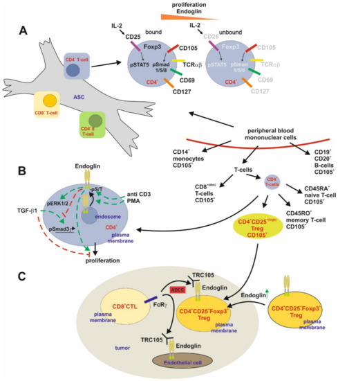 Endoglin expression and function in T cells. (A) Adipose tissue derived stem cells (ASC) are able to regulate T-cell dependent immune responses in part by sequestering reactive CD4+ T-cells. Allo-activated CD4+ T cells tightly bound to ASC show a higher CD25 expression and in turn IL-2-dependent STAT5 activation. These cells present a higher proliferation and increased Endoglin (Eng) expression along with a higher Smad1/5/8 phosphorylation (activation). Nevertheless, aside the higher Foxp3 expression, the bound cells also had a higher CD127 expression excluding that they are Tregs. (B) High expression of Eng is present in CD4+ T-cells isolated from peripheral blood. TCR/pathway activation of these CD4+ T-cells by CD3 or PMA leads to a higher surface expression of Eng and increased serine/threonine phosphorylation of the receptor. Activation of Eng induces ERK1/2 phosphorylation and higher proliferation. On the other hand, Eng interferes with TGF-β1-mediated Smad signaling and inhibition of proliferation. (C) In the setting of tumorigenesis, intratumoral CD4+ T-cells, i.e., CD25+/Foxp3+ Tregs, express higher Eng compared to their circulating counterparts. This causes an antibody-dependent cellular cytotoxicity (ADCC) resulting in reduction of intratumoral Tregs (immunosuppressive) upon application of TRC105 via CD8+ T-cells.