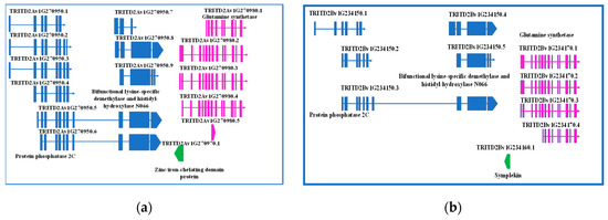 Detailed representation of genes located upstream GS2-2A (a) and GS-2B (b) genes, their structures, function, and eventual splicing isoforms.