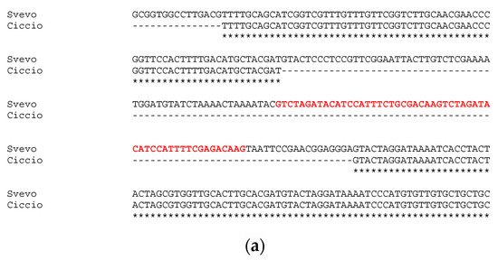 Sequencing of approximatively 1 kb upstream the first exon of GS-A2 gene revealed an identity of 100% between Svevo and Ciccio sequences, with no gaps or single nucleotide polymorphisms detected. Instead, the sequencing and analysis of GS-B2 gene promoter region highlighted a slightly different situation. The alignment of GS2-B2 gene promoters of Svevo and Ciccio revealed a 132-bp deletion in Ciccio cv (Figure 2a). The deletion in Ciccio cv entailed the loss of 83 bp of the previously reported conserved element, including a 55 bp tandem repeat, whose 27-bp seed was repeated twice.
