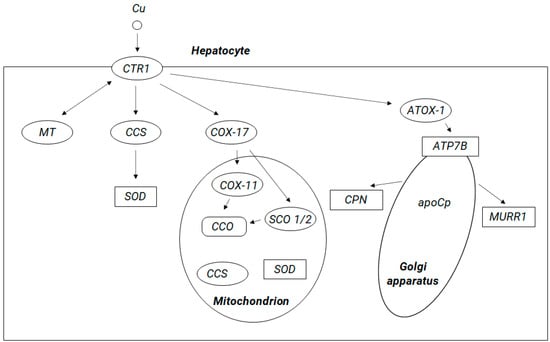 Circulating copper enters cells through the membrane protein called copper transporter 1 (CTR1). Inside the cell, copper can (1) remain in the cytosol in a form bound to metallothioneins (MT) or glutathione, (2) be incorporated via the copper chaperone for copper, zinc superoxide dismutase (Cu,Zn-SOD, SOD1 (CCS)) into the cytoplasmic enzyme SOD1, which protects cells from free radical damage, (3) be transferred to the mitochondria (with participation of the chaperone COX17 (chaperone for cytochrome c oxidase)) and be incorporated into the cytochrome c oxidase (CCO) molecule, and (4) be transferred to the structures of the Golgi apparatus with antioxidant protein 1 (ATOX1), acting as a chaperone for ATP-ase 7B). ATP7B, a protein located in membranes of Golgi apparatus, transports copper to the bile ducts for excretion in feces (with participation of the MURR1 protein, reannotated to “copper metabolism MURR1 domain-containing protein 1”, COMMD1) and enables incorporation of copper into apoceruloplasmin (apoCp) to produce mature ceruloplasmin (CPN) (the main copper transport protein in the peripheral blood) and SCO 1/2 (cytochrome c oxidase assembly protein 1/2).