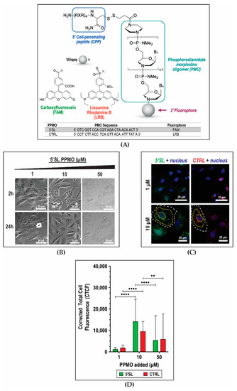 We evaluated the potential of antiviral 5′SL PPMO (Figure 1A), which was designed to bind the Dengue virus seroptype-2 (DENV2) genome (Figure S1), as an imaging agent for DENV2 cellular infection; and compared its performance as a DENV-specific probe to a non-targeted control (CTRL) PPMO that was designed to not bind to the DENV2 genome (Figure S2). These PPMOs were described as naturally stable and delivered into cells with the aid of a cell-penetrating peptide (RxR)4B (Figure 1A) [38]. The 5′SL PPMO sequence was also target-specific and did not target other mRNA sequences in the cell (Figure S1). Moreover, the 5′SL and CTRL PPMOs were labeled with distinct fluorophore tags to facilitate simultaneous imaging in cells (Figure 1A).