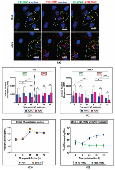 Live-cell monitoring of Dengue virus infection with PPMOs. (A) Representative deconvoluted fluorescent images of live monkey kidney (Vero) cells at 6 h post-infection. Cells are infected with 1 MOI Dengue virus serotype-2 (DENV2) for 1 h and immediately pulsed with either DENV2-targeted 5′SL and non-targeted CTRL PPMOs (10 µM final concentration, 10 min). The cell boundary is outlined in white dashed lines, and sample regions of interest (ROIs) used in fluorescence signal quantification are outlined in yellow dotted lines. Sample foci where the PPMOs colocalize are indicated by the yellow arrows, and where the PPMOs do not colocalize are indicated by the blue arrows. (B,C) Quantification of fluorescence signals over time within DENV2-infected and mock-infected (B) Vero and (C) baby hamster kidney (BHK-21) cells incubated with both 5′SL and CTRL PPMOs. The Corrected Total Cell Fluorescence (CTCF) is calculated by subtracting the contribution of background intensity from the integrated fluorescence density within the ROIs. (D) DENV2 replication kinetics in Vero and BHK-21 cells infected with 1 MOI virus (n = 6). (E) DENV2 replication kinetics in Vero cells infected with 1 MOI virus in the presence of 10 µM 5′SL PPMO (n = 6). Cells are pulsed with PPMOs at 1 h post-infection. Mean values in (B–C) are compared with two-way ANOVA. *, p < 0.05; **, p <0.005; ****, p < 0.0001; ns, not significant.