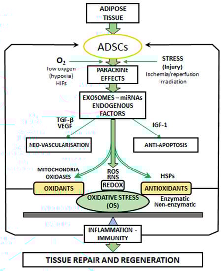 Paracrine effects of adipose-derived stem cells (ADSCs). ADSCs secrete vascular endothelial growth factor (VEGF), microRNAs (miRNAs), insulin-like growth factor-1 (IGF-1), and exosomes for promoting neovascularization and anti-apoptosis. ADSCs promote angiogenesis by producing vascular endothelial growth factor (VEGF) and transforming growth factor beta (TGF-β). Stress and local injury (ischemia/reperfusion, irradiation) induce ADSC activation. ADSCs exist in low oxygen conditions (hypoxia), and hypoxia-inducible factors (HIFs) regulate the signaling pathways. OS is the result of imbalance between the generation of oxidants: reactive oxygen species (ROS) and the antioxidant defense systems. The main cellular sources of ROS are mitochondria and oxidases. Antioxidants are represented by the enzymatic and non-enzymatic activities and HSP expression. The oxidation-reduction (REDOX) balance in the ROS and RNS (reactive nitrogen species: derived from nitric oxide: NO) mechanisms is involved in tissue repair and regeneration induced by ADSCs through the modification of OS levels. OS is recognized as a contributing factor in inflammation and immunity pathways.