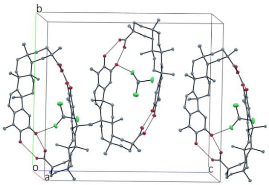 The chloroform solvent provides for additional intermolecular interactions in the crystal: a hydrogen bond C1S-H1S···O4 (donor-acceptor 3.234(9) Å) and C-H-O bond angle 141° along with a halogen bond between Cl2 and the carbonyl O102 of celastrol at a distance of 3.088 Å, shorter than the sum of van der Waals radii, and with the C-Cl-O angle of 155°, Figure 3. Table 1 shows crystal data.
