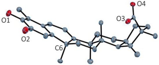 Celastrol molecule showing the conformation of the individual rings: planar for the methide quinone ring A on the left; envelope with C6 out of plane for adjacent ring B; remaining three rings are in chair conformation. H atoms are not shown for clarity.