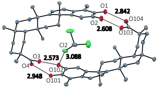 Asymmetric unit dimeric structure with chloroform solvent showing H-bond and halogen bond distances. H atoms not shown for clarity.