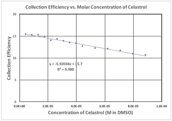 Celastrol is a methide quinone having two hydroxyl groups, Scheme 1, and these may be involved in sequestering superoxide, as clarified through DFT calculation. From the RRDE graph, Figure 4, it is seen that progressive amounts of celastrol decrease but cannot deplete the superoxide content in the voltaic cell. The signal detected at the ring electrode is located at the upper part of the graph, and shows that at the maximum celastrol concentration, 9.0 × 10−5 M, there is still superoxide in the voltaic cell.
