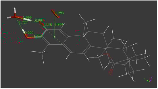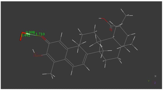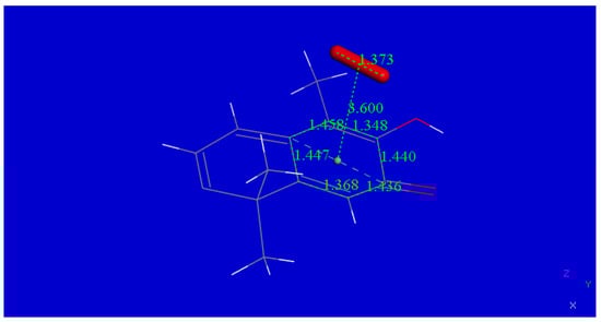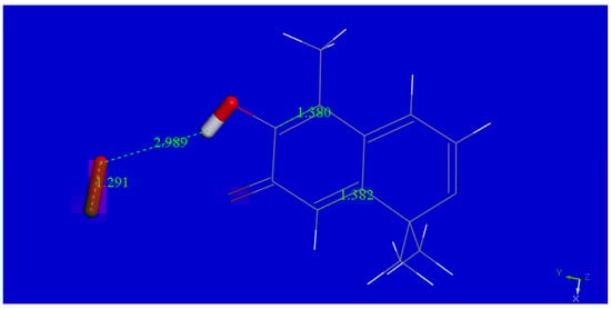 Superoxide π-π approached by model celastrol, final state, obtained after density functional theory (DFT) geometry optimization. Comparing with Figure 8, there is lengthening of the ring C-C double bonds, 1.382 Å and 1.378 Å, and shortening of O-O bond, 1.286, due to O2 formation.