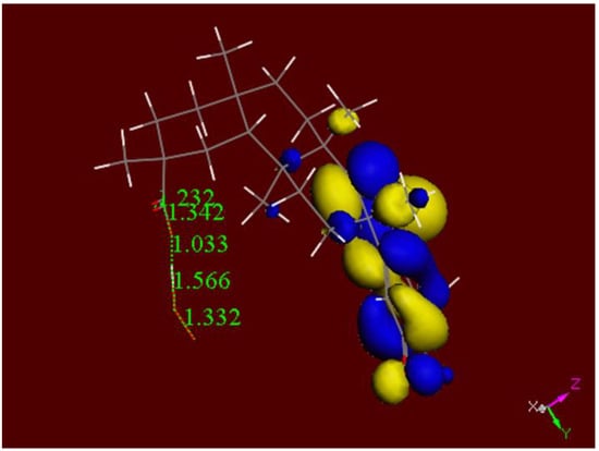 LUMO for the complex celastrol-carboxylic-moiety-superoxide, total charge −1. LUMO indicates further reactivity in the methide quinone area of this complex.
