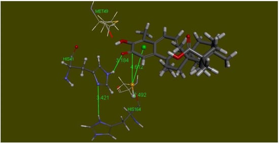 Docking pose 5 displays the essential amino acids, Cys145 (line style, not labeled for clarity), His41 (ball style), Met49 (line style), and His164 (stick style). S(Cys145) points to the quinoid ring centroid, 4.989 Å (value not shown for clarity), and the quinoid carbonyl, 4.612 Å. Met149 is rather detached from ring B centroid.