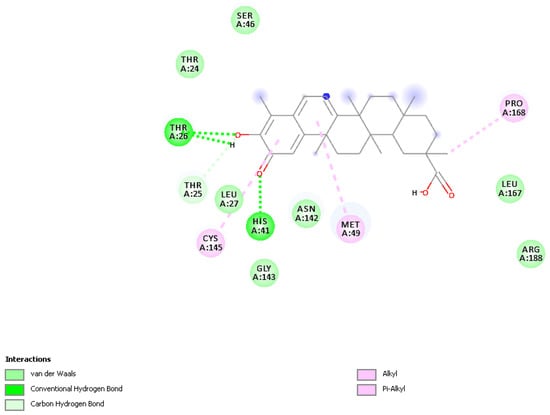 The interaction between cysteine and quinones has been noted [] and includes a recent description of the quinone embelin establishing an important covalent bond with Cys145 of the main COVID-19 protease 3CLpro to explain the inhibitory mechanism []. Since the methide quinone celastrol shows inhibition towards SARS-CoV 3CLpro [], such an association between celastrol and the active site cysteine in the COVID-19 protease is supported. Moreover, celastrol antiviral activity is described for infectious bronchitis virus [], influenza A [], hepatitis C [], dengue [], and HIV [].