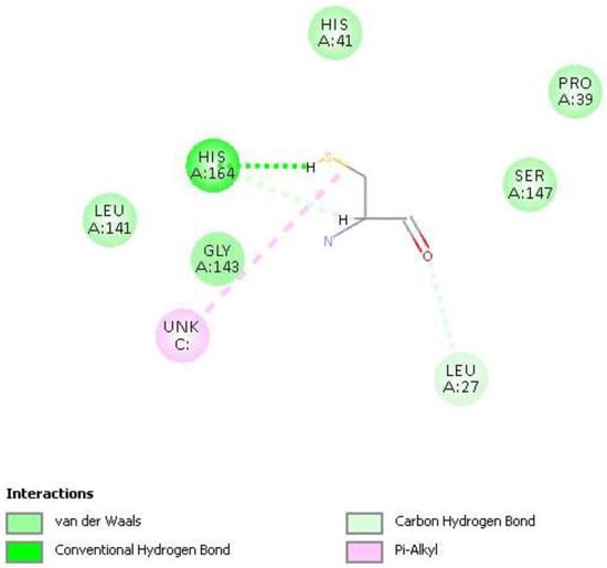 The SARS 3CLpro protease active site was obtained after downloading coordinates from the PDB database, PDB ID: 6LU7 []. The published protein included the inhibitor N3 and was treated with the Discovery Studio “prepare protein” protocol, which provides assignment of CHARMm force field and addition of H atoms. The inhibitor was removed and the binding site was chosen after selecting Cys145 and His41 amino acids, for a sphere of radius 14 Å. Results of docking celastrol (15 poses) were analyzed focusing attention on interactions between S(Cys145) and the methide quinone centroid, which were found in closely related poses 5, 13, and 14. Pose 5 has CDOCKER interaction energy of −41.7 kcal/mol and was selected for further study. Figure 13 displays essential amino acids useful for description of the mechanism. Pose 5 was also treated with Discovery Studio standard dynamic cascade protocol, Figure 14, and results show a marked increase in interactions between celastrol and the active site. Thus, H(His41) H-bond to celastrol carbonyl of 3.184 Å (docking) gets shorter after dynamics (2.181 Å); S(Cys145) directed to the quinoid carbonyl, 4.612 Å (docking), becomes slightly closer after dynamics, 4.559 Å. The dynamic cascade shows O(His164) H bond to H-S(Cys145) of 2.138 Å, suggesting H capture and thiolate formation, for further attack on the celastrol carbonyl by the latter. Thus, capture of H(His41) by the celastrol carbonyl, and O(His164) capture of H-S(Cys145) generating S(Cys145) thiolate, are shown in Figure 15, having the S(thiolate) pointing to the celastrol C(carbonyl), 3.347 Å. In addition, further stabilization of the celastrol-protease complex is provided by Met49, which was initially distant from celastrol in docking pose 5, but after dynamic cascade gets closer to the ring B centroid of celastrol, 4.480 Å, establishing a π interaction, in agreement with ring B capability to interact with nucleophilic S atoms []. The 2D interaction display for celastrol after dynamic cascade is shown in Figure 16, while that for Cys145 showing H-bond to O(His164) is depicted in Figure 17.