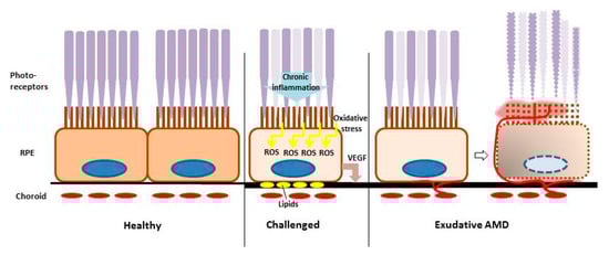 Oxidative stress is considered a major pathomechanism for all forms of AMD. Pathologic angiogenesis, on the other hand, is indicative of the exudative form of this disease. Here, vessels arise from the choroid and grow beneath or into the retina []. These vessels are leaky and can cause edema, and may turn into fibrotic scar tissue []. Retinal tissues degenerate rapidly in exudative AMD, which is responsible for the majority of severe loss of visual acuity in AMD []. Angiogenesis is a complex procedure involving several angiogenic factors. The major angiogenic factor in health and disease is vascular endothelial growth factor (VEGF) []. VEGF is involved in several retinal diseases, such as retinopathy of prematurity, diabetic retinopathy, and age-related macular degeneration []. It is secreted by a variety of cells of the retina, but regarding AMD, the RPE is the most important source []. VEGF secretion by the RPE is enhanced by many stimuli, such as hypoxia, oxidative stress, and pro-inflammatory stimuli [,,,]. Enhanced VEGF secretion of the RPE combined with defects in the underlying Bruch’s membrane induce the growth of pathologic vessels from the choroid (choroidal neovascularizations (CNV)) [,]. For exudative AMD, anti-VEGF therapy has become the gold standard []. However, while vessels regress and some visual acuity may be won under this therapy, generally, long term treatment is needed and visual decline can usually not be prevented in the long term [].