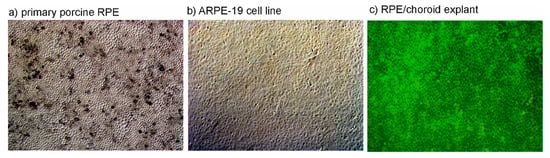 Experiments with cultured cells (primary cells or cell line) are valuable models, but do not reflect the complexity of tissue interaction. The RPE in situ is in close contact with the underlying choroid, communicating with this tissue. An elegant way to model this interaction is using RPE/choroid explant models derived from porcine eyes (Figure 2c). For investigation of, e.g., cytokine release, these explants can be cultured in a perfusion chamber, which enables a steady-state equilibrium []. In addition to specialized RPE cells, other cell types of ocular origin may be of interest for certain objectives (see below).