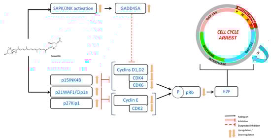 In bladder and colon cancer cells, this arrest in the cell cycle is mediated by the upregulation of p21WAF1/Cip1, a cyclin-dependent kinase (CDK)-inhibitory protein [54,57]. The molecular mechanism of cell cycle arrest also involves the downregulation of cyclin D1 and CDK4 complex in B cell malignancies, bladder cancer, melanoma, and HepG2 hepatocarcinoma cell lines [19,54,55,62]. In bladder cancer cells, a decrease of CDK-2 and cyclin E was also observed [54], whereas a decrease of cyclin D2 appears in B cell malignancies and melanoma cells [19,55], and a decreased expression of CDK4, CDK6, and cyclin E could be found in adult T-cell Leukemia [52]. In the HepG2 cell line, Das et al. observed a downregulation of the kinase activity of cyclin D and CDK4 complex, responsible for the phosphorylation of Ser780 of retinoblastoma protein (pRb) [62]. Also, Kim et al. showed a clear lowering of the protein expression of phosphorylated pRb (phospho-pRb), cyclin D1, cyclin D2, and CDK4. They also observed an upregulation of the proteins p27Kip1 and p15INK4B in B16-F10 cells (melanoma) treated with fucoxanthin [55]. In contrast, in colon cancer cell lines, Das et al. have shown that G0/G1 phase arrest was mediated through the increased phosphorylation of pRB and upregulation of p21WAF1/Cip1 but not p27Kip1, and without changes in the protein levels of the D-types of cyclin and CDK4 [57]. In addition, the study of Satomi et al., using prostate cancer cell lines, suggested that GADD45A and Jun-N-terminal kinase (JNK) might be involved in fucoxanthin-induced G1 cell cycle arrest [58]. Curiously, only one study has reported a fucoxanthin-induced cell cycle arrest in G2/M phase, which was related to a decreased expression of cyclin B1 and survivin in human gastric adenocarcinoma MGC-803 cells [56].
